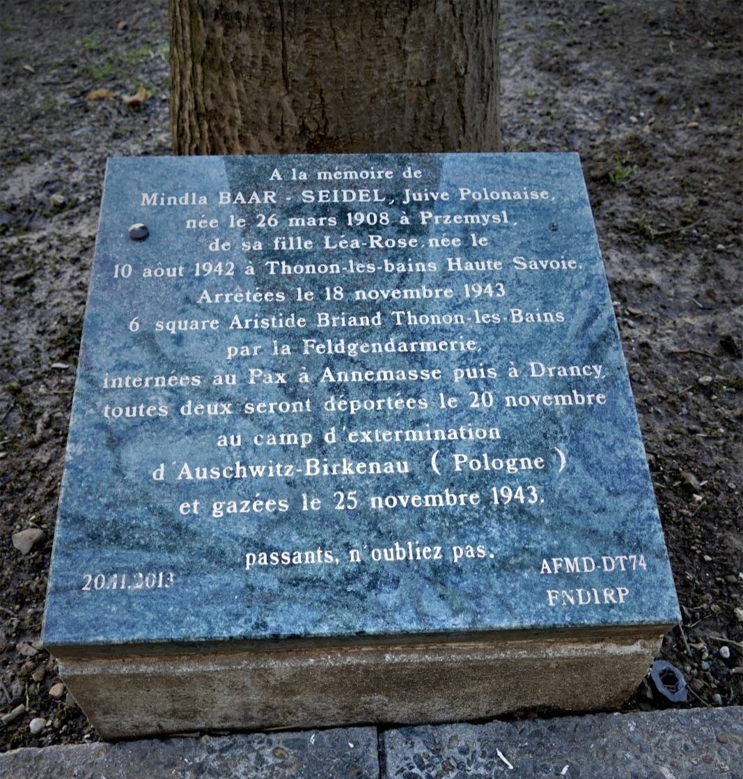 Le 18 novembre 1943, Mindela Baar, réfugiée juive polonaise installée à Thonon depuis 1938, est arrêtée avec sa fille Léa Rose, âgée de seulement 15 mois, née à Thonon.