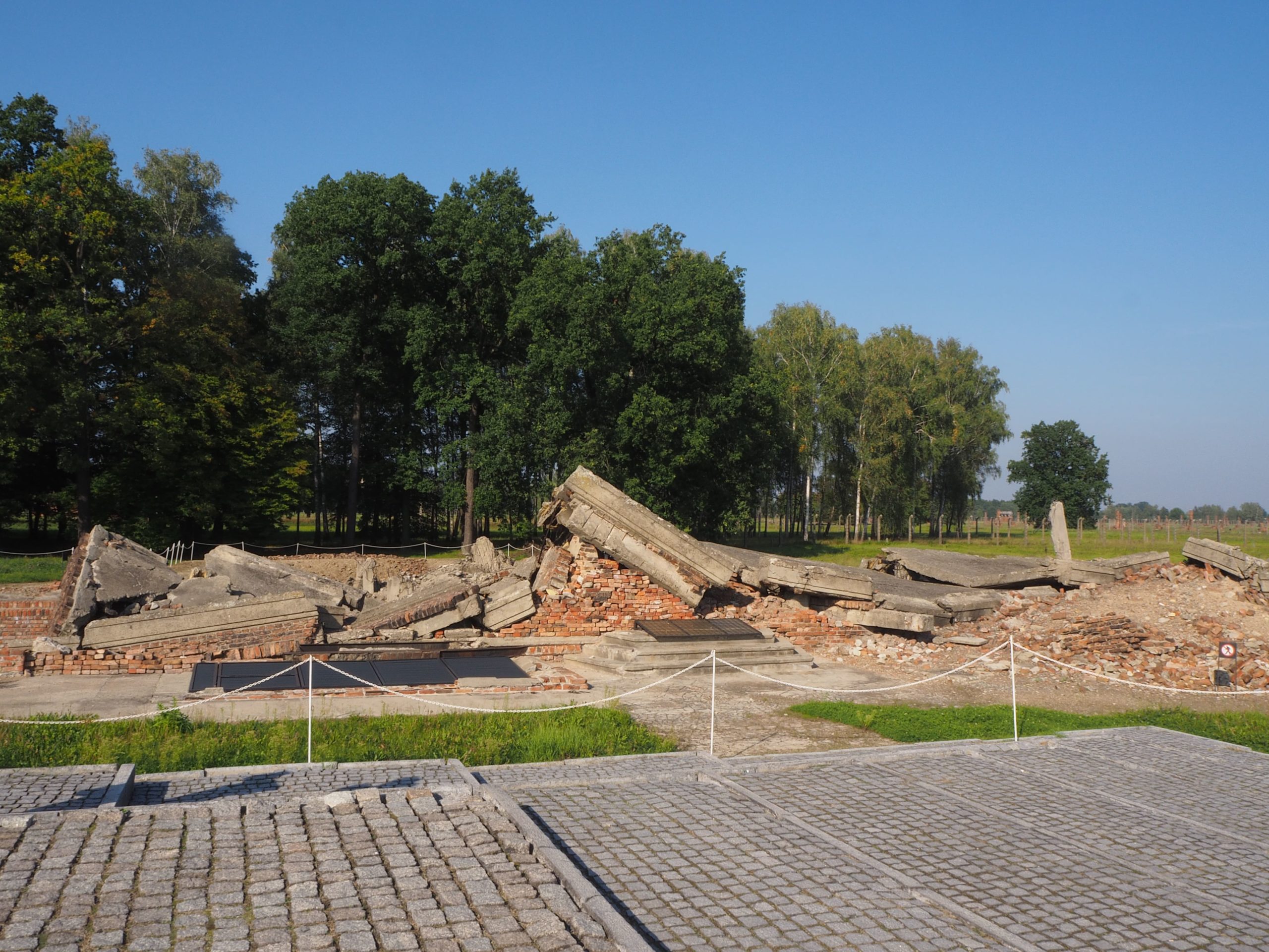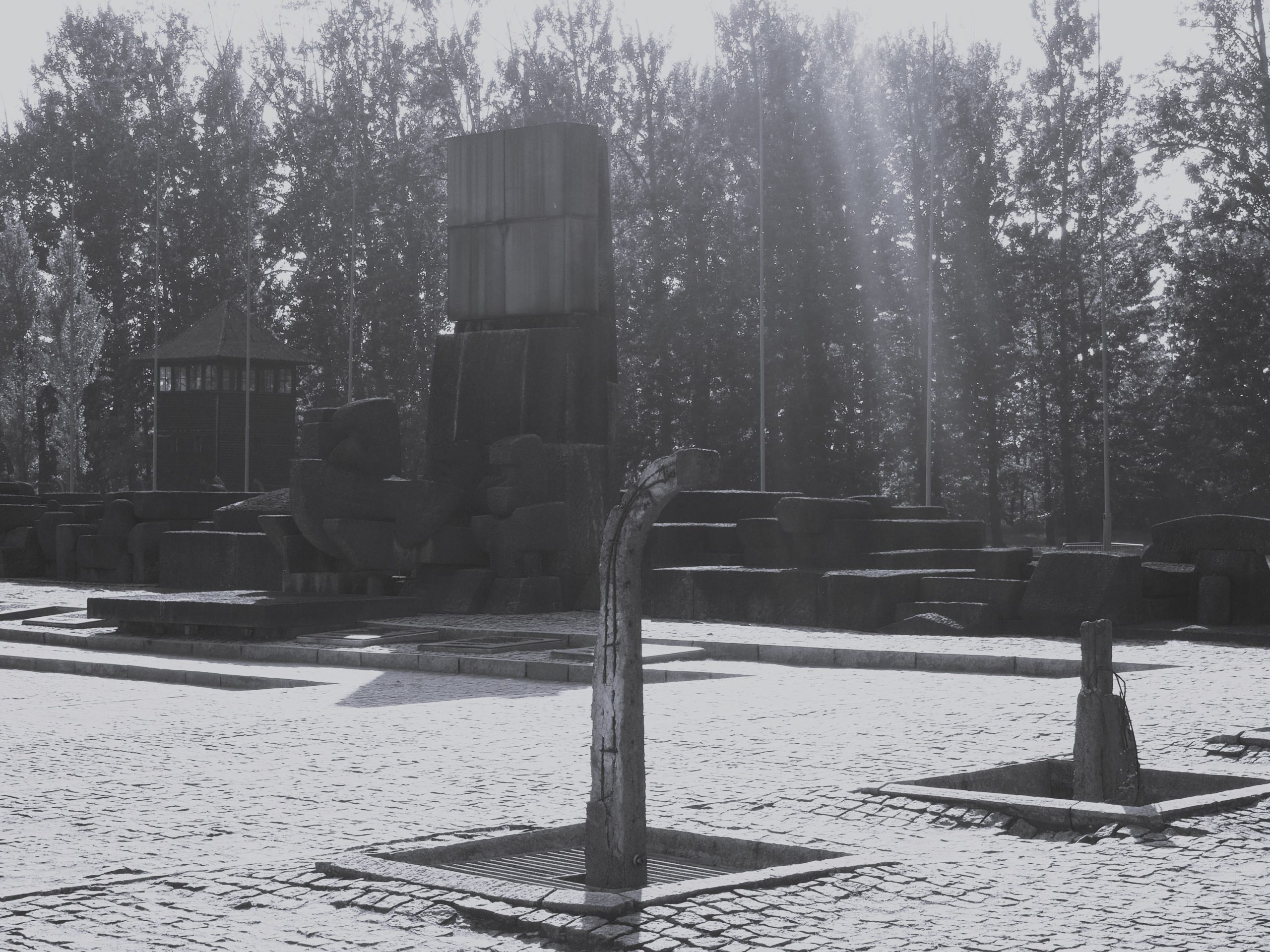 L’après-midi, nous visitâmes Auschwitz II. Cette image que nous connaissons et qui est présente sur la page d’accueil de notre site nous glace le sang. Auschwitz II est un camp de concentration et d’extermination à la fois. Le camp s’étend sur des hectares ; il n’est pas restauré mais conservé en l’état. Nous avons pu nous recueillir sur le mémorial, qui comporte une stèle par langue.